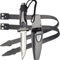The Sub Gear SK-21 Knife is a Diver’s Tool. This Knife is available in 2-Model Choices, Corrosion Resistant 304-Grade Stainless Blade or Corrosion Proof and Lightweight Titanium. Both Models come equipped with a Straight Edge on one side and a Serrated Edge on the other. The Blade Tip is a Drop Point Design and the Knife also comes with a Line Cutter on the Blade. The Butt of the Knife has a Metal Cap which is handy as a Hammer Device making this one versatile Dive Tool. The Ergonomically Designed Hand Grip gives positive retention even when wearing thick gloves and the Wrist Lanyard Hole comes in handy when you attach a Lanyard and need to let the knife go. The Knife Blade measures 4.7″ (12cm) and the knife comes with a Thick Strong and Durable Plastic Sheath with Push Button Knife Release and Leg Straps for mounting the knife.